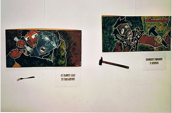La scène comporte des séquences de violences conjugales sur un mode ludique qui mettent en scène des situations possibles. L’exposition elle-même proposait au-dessous de chaque huile sur toile l’objet réel du crime (hachoir à viande, téléphone etc.) pour ajouter à l’effet spectaculaire.